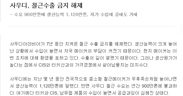 사우디 철근 수출금지 해제 페이지 정보 작성자 더로스 댓글 댓글 0건 조회Hit 482회 작성일Date 15-02-23 09:00 본문 사우디 철근 수출금지 해제 목록 이전글한국선재 일본산 철판,형강류 수입 판매 개시 15.02.23 다음글제강사 수입형강 대응 의지 확인 15.02.23 댓글 0 댓글목록 등록된 댓글이 없습니다.