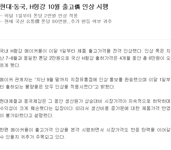 국내 H형강 메이커들이 이달 1일부터 제품 출고가격을 전격 인상했다. 인상 폭은 지난 7~8월과 동일한 톤당 2만원으로 국산 H형강 출하가격은 4개월 동안 총 6만원이 오르게 됐다.