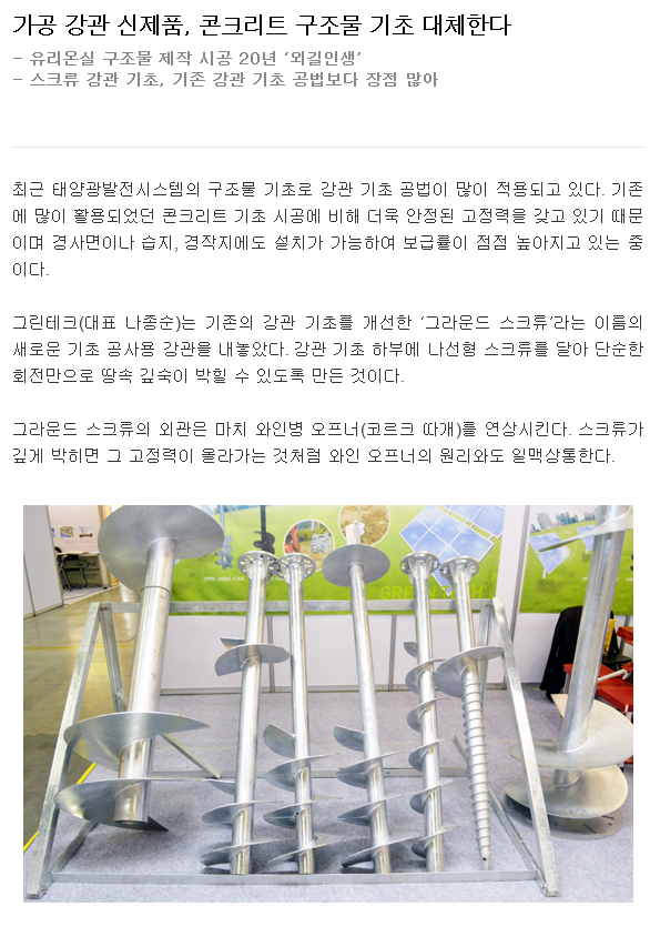 최근 태양광발전시스템의 구조물 기초로 강관 기초 공법이 많이 적용되고 있다. 기존에 많이 활용되었던 콘크리트 기초 시공에 비해 더욱 안정된 고정력을 갖고 있기 때문이며 경사면이나 습지, 경작지에도 설치가 가능하여 보급률이 점점 높아지고 있는 중이다. 그린테크(대표 나종순)는 기존의 강관 기초를 개선한 ‘그라운드 스크류’라는 이름의 새로운 기초 공사용 강관을 내놓았다. 강관 기초 하부에 나선형 스크류를 달아 단순한 회전만으로 땅속 깊숙이 박힐 수 있도록 만든 것이다. 그라운드 스크류의 외관은 마치 와인병 오프너(코르크 따개)를 연상시킨다. 스크류가 깊게 박히면 그 고정력이 올라가는 것처럼 와인 오프너의 원리와도 일맥상통한다.