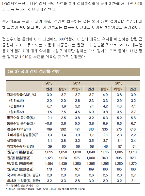 내년 우리나라의 경제성장률이 올해 3.7%에 비해 소폭 높아진 3.9%를 기록할 것으로 전망됐다. LG경제연구원은 내년 경제 전망 자료를 통해 경제성장률이 올해 3.7%에서 내년 3.9%로 소폭 높아질 것으로 예상했다. 중기적으로 우리 경제가 4%대 성장을 회복하는 것은 쉽지 않을 것이라며 성장에 비해 고용이 확대되고 물가가 안정되는 흐름은 내년에도 이어질 전망이라고 설명했다. 경상수지는 올해에 이어 내년에도 600억달러 이상의 대규모 흑자를 예상하는 한편 금융완화 기조가 유지되는 가운데 시중금리는 완만하게 상승할 것으로 보이며 대부분 통화가 달러화에 대해 약세를 보일 것이지만 원화는 다시 강세기 조로 돌아서 내년 평균 달러당 1,010원 수준을 기록할 것으로 전망했다.