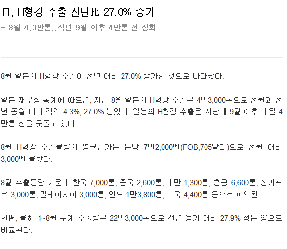 日, H형강 수출 전년比 27.0% 증가