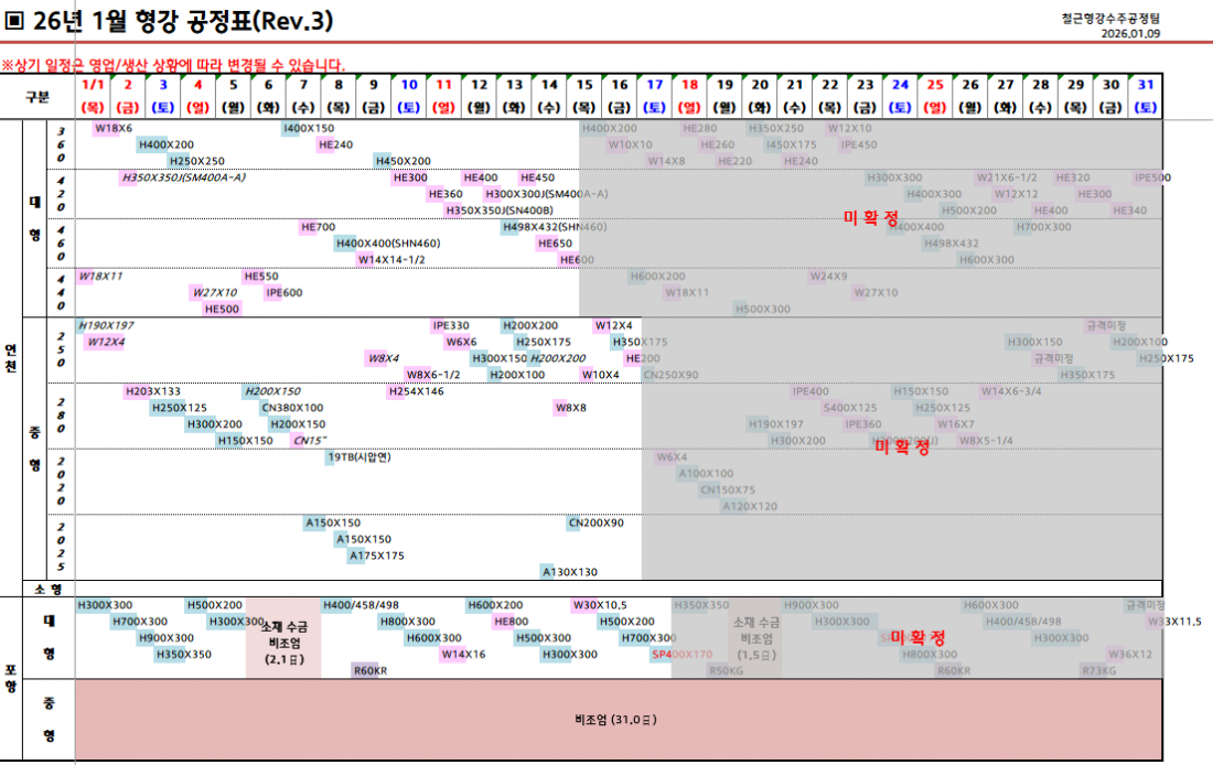 26년 1월 철강 생산일정 및 제강사 재고현황입니다.