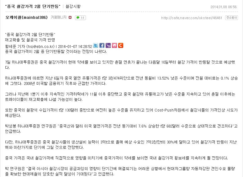 중국철강가격 단기 반등 춘절이 끝나고 단기 반등 예상된다고 예상 페이지 정보 작성자 더로스 댓글 댓글 0건 조회Hit 4,244회 작성일Date 14-01-13 09:18 본문 ㅇ 목록 이전글2014년2월3일 재고 (동국제강,현대제철) 14.02.02 다음글구정전까지는 철강가격 보합세입니다. 수입철근은 620원 국산 670,690원입니다. 형강 수입 685, 국산810원입니다. 14.01.04 댓글 0 댓글목록 등록된 댓글이 없습니다.